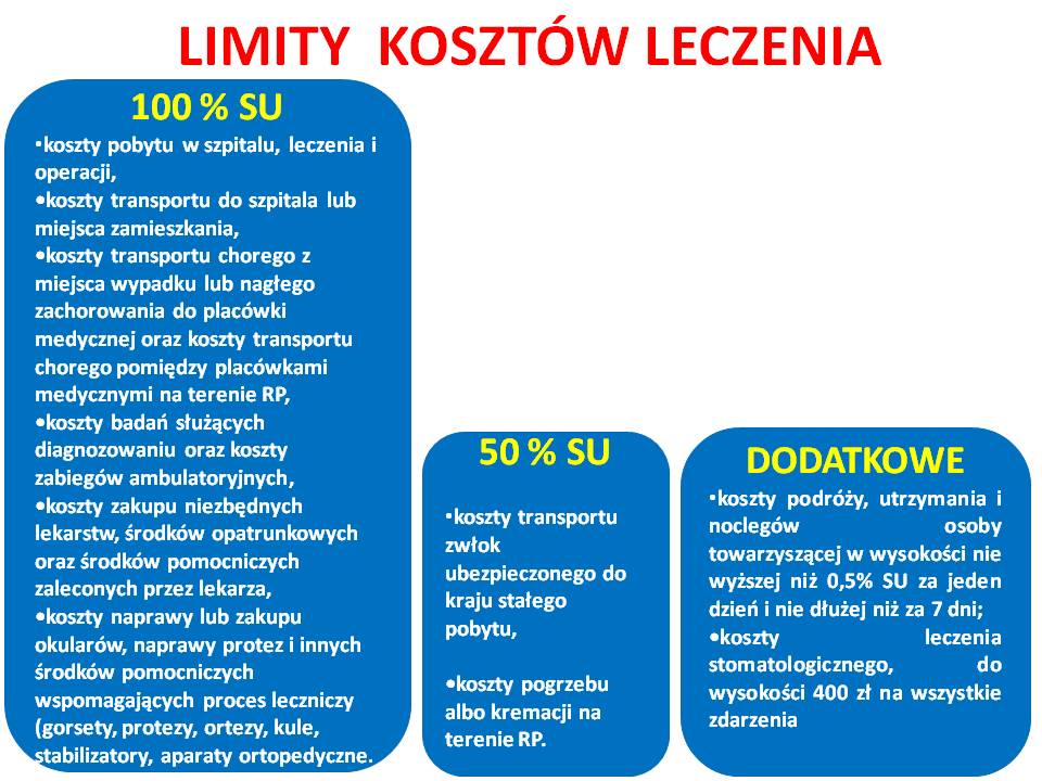 Ponadto w ramach sumy ubezpieczenia występują podlimity. W klauzuli kosztów leczenia cudzoziemca koszty transportu zwłok ubezpieczonego do kraju stałego pobytu oraz koszty pogrzebu albo kremacji na terenie RP refundowane są do połowy sumy ubezpieczenia. Zakład ubezpieczeń zwraca wydatki na leczenie stomatologicznego do 400 PLN bez względu ilość wykonanych procedur medycznych. Z kolei finansowanie kosztów podróży, utrzymania i noclegów osoby towarzyszącej nie może przekroczyć 0,5% SU za jeden dzień. Refundacji podlegają koszty podróży, utrzymania i noclegów osoby towarzyszącej maksymalnie za 7 dni.