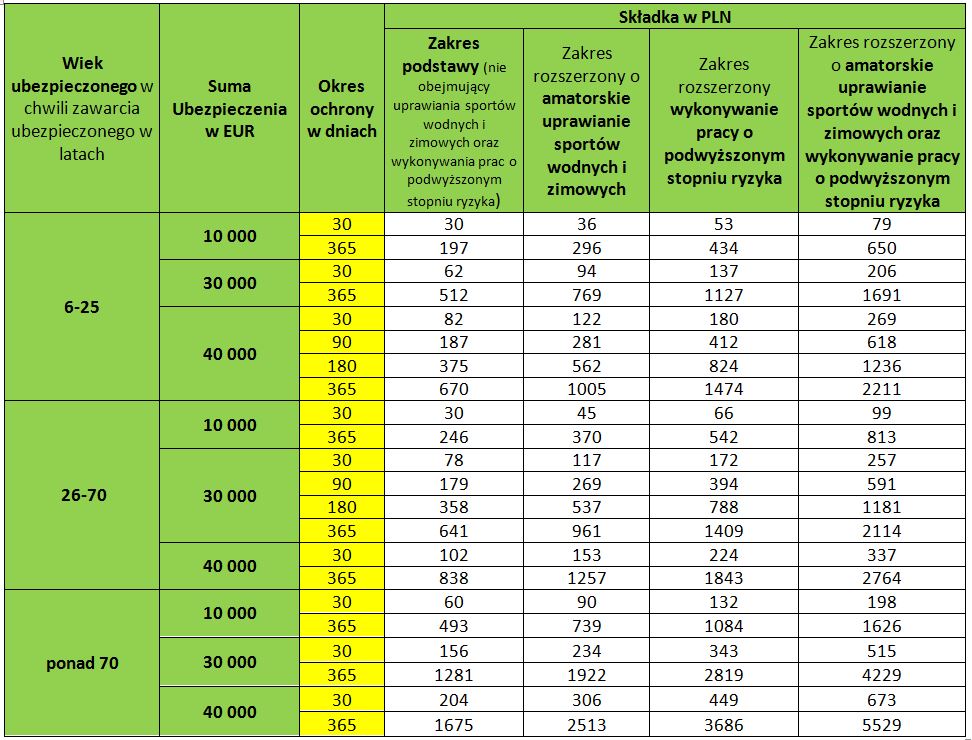 - zakresu ochrony (w szczególności czy pokrycie ubezpieczeniowe rozszerzono o wykonywanie prac podwyższonego ryzyka lub amatorskie uprawianie sportów wysokiego ryzyka)