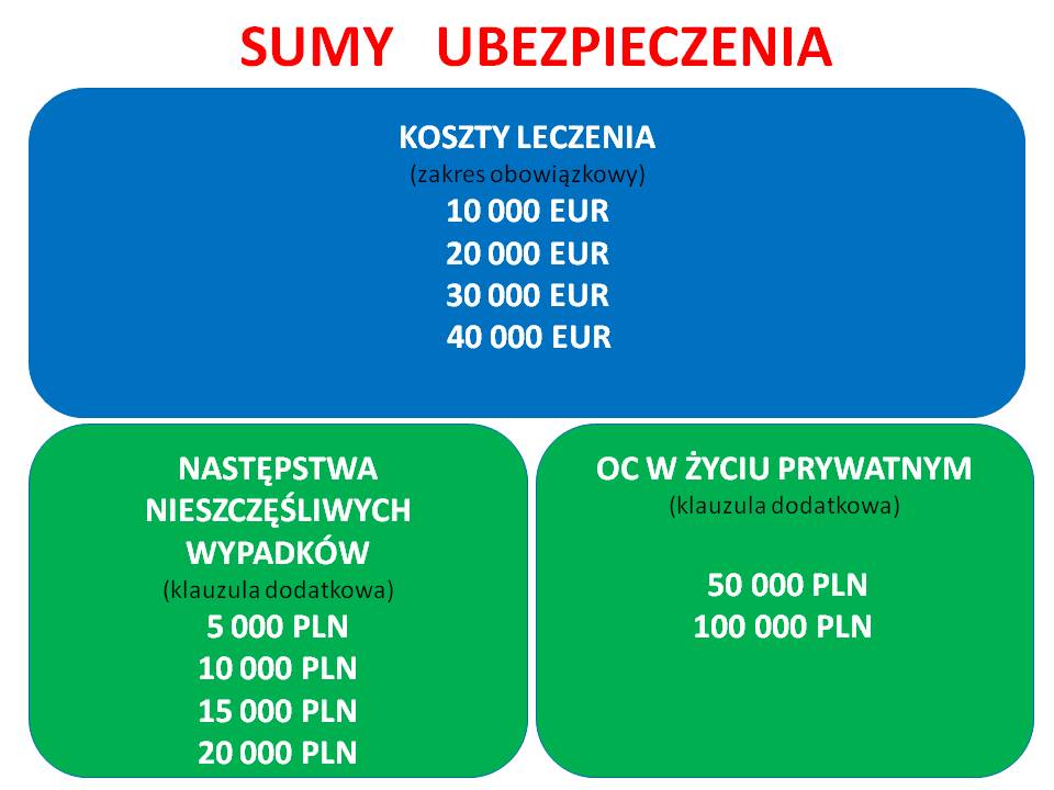 W zakresie ubezpieczenia od następstw nieszczęśliwych wypadków dostępna są sumy 5 000, 10 000, 15 000, 20 000 PLN. Natomiast w ubezpieczeniu OC w życiu prywatnym można wybrać sumę 50 000 PLN albo 100 000 PLN.